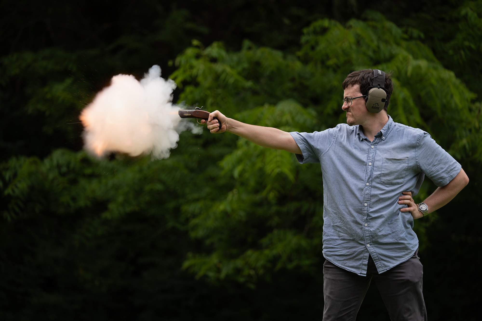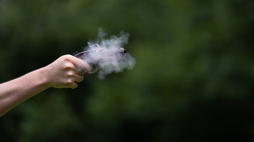 Ignition! The percussion cap has fired, but the main powder charge hasn’t caught yet.